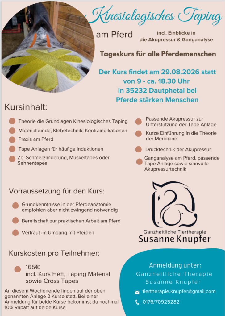 Inhalt im Überblick: Grundlagen des Tapings, einfache Anwendung am Pferd, Ganganalyse vor Ort, passende Akupressurpunkte, Praxisübungen am eigenen Pferd.
