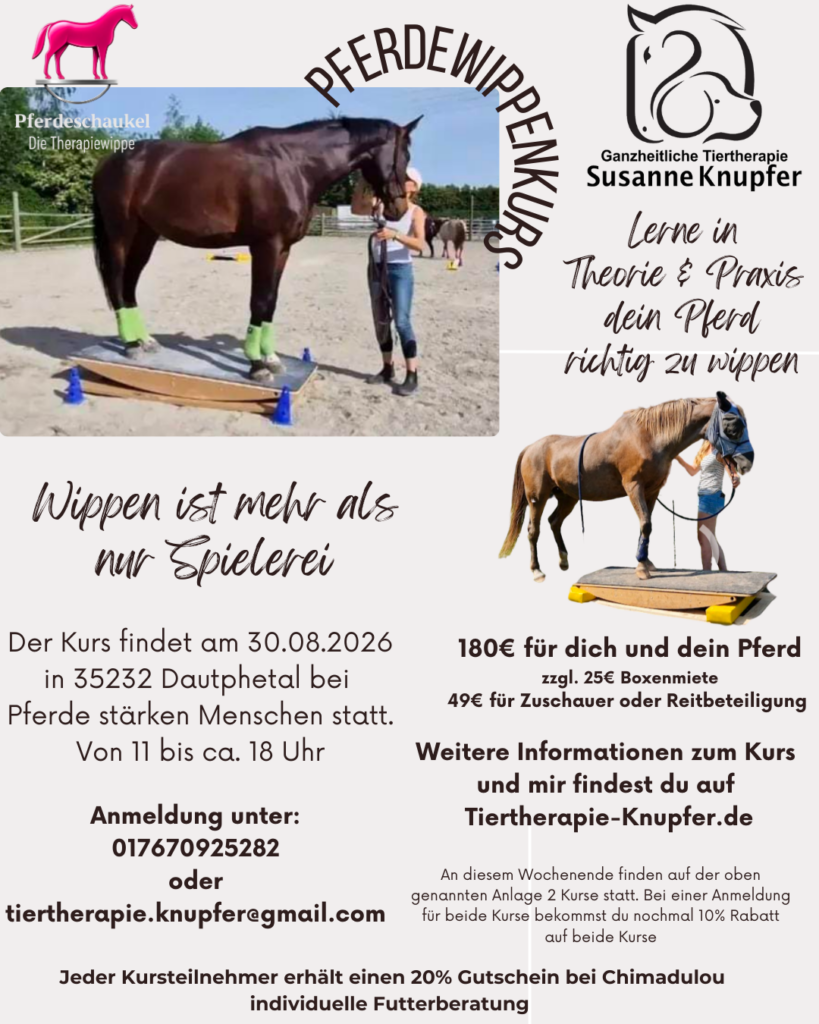 - Was du lernst: Balance- und Gleichgewichtstraining, sanfte Druck- und Stütztechniken. In Theorie und Praxisnah mit Bodenarbeit und Übungen direkt an der Pferdewippe .