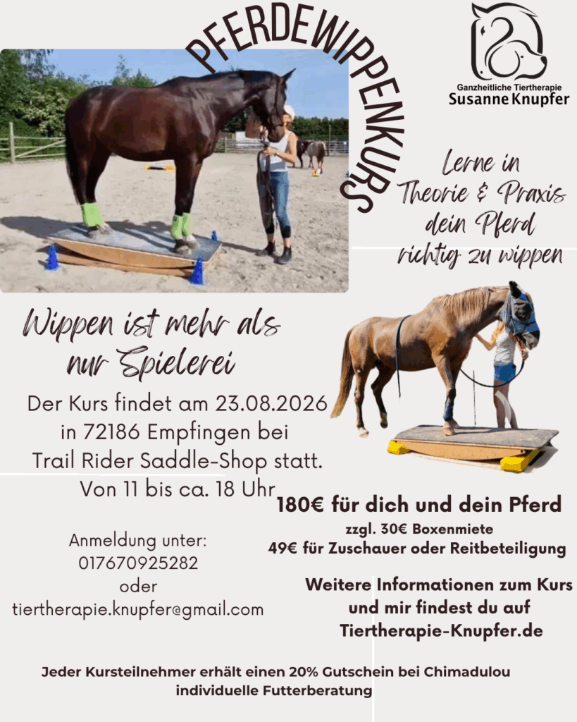- Was du lernst: Balance- und Gleichgewichtstraining, sanfte Druck- und Stütztechniken. In Theorie und Praxisnah mit Bodenarbeit und Übungen direkt an der Pferdewippe .