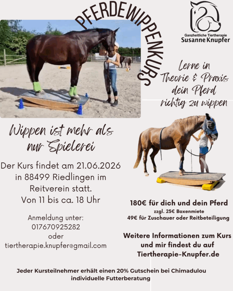 • Was du lernst: Balance- und Gleichgewichtstraining, sanfte Druck- und Stütztechniken. In Theorie und Praxisnah mit Bodenarbeit und Übungen direkt an der Pferdewippe .